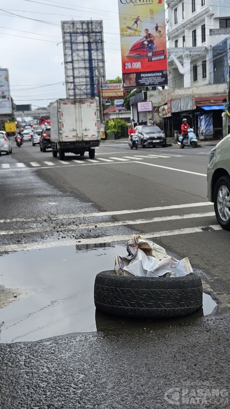 Hingga kini jalan berlubang di jalan Raya Jatiwaringin sebelum flyover tol arah Kalimalang belum juga diperbaiki. Sangat berbahaya bagi pengendara motor.