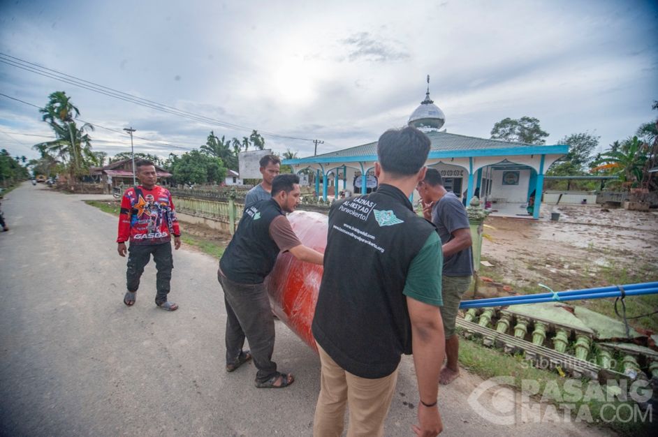 Laznas Al Irsyad bersama relawan lokal membangun dapur umum di Mushola Tepah untuk melayani kebutuhan makan sehari-hari warga korban banjir di Desa Matang Tepah, Kecamatan Bendahara, Kabupaten Aceh Tamiang. 17 Desember 2025.