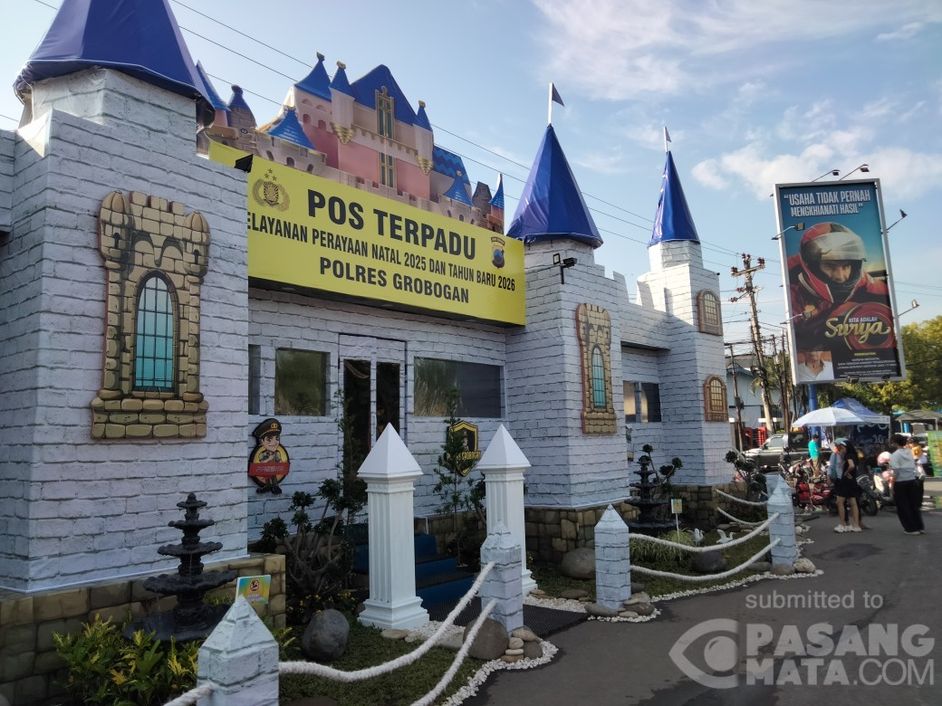 Pos terpadu pelayanan perayaan Natal 2025 dan Tahun Baru 2026 Polres Grobogan terlihat mewah dan keren. Terletak di Simpang Lima Purwodadi.