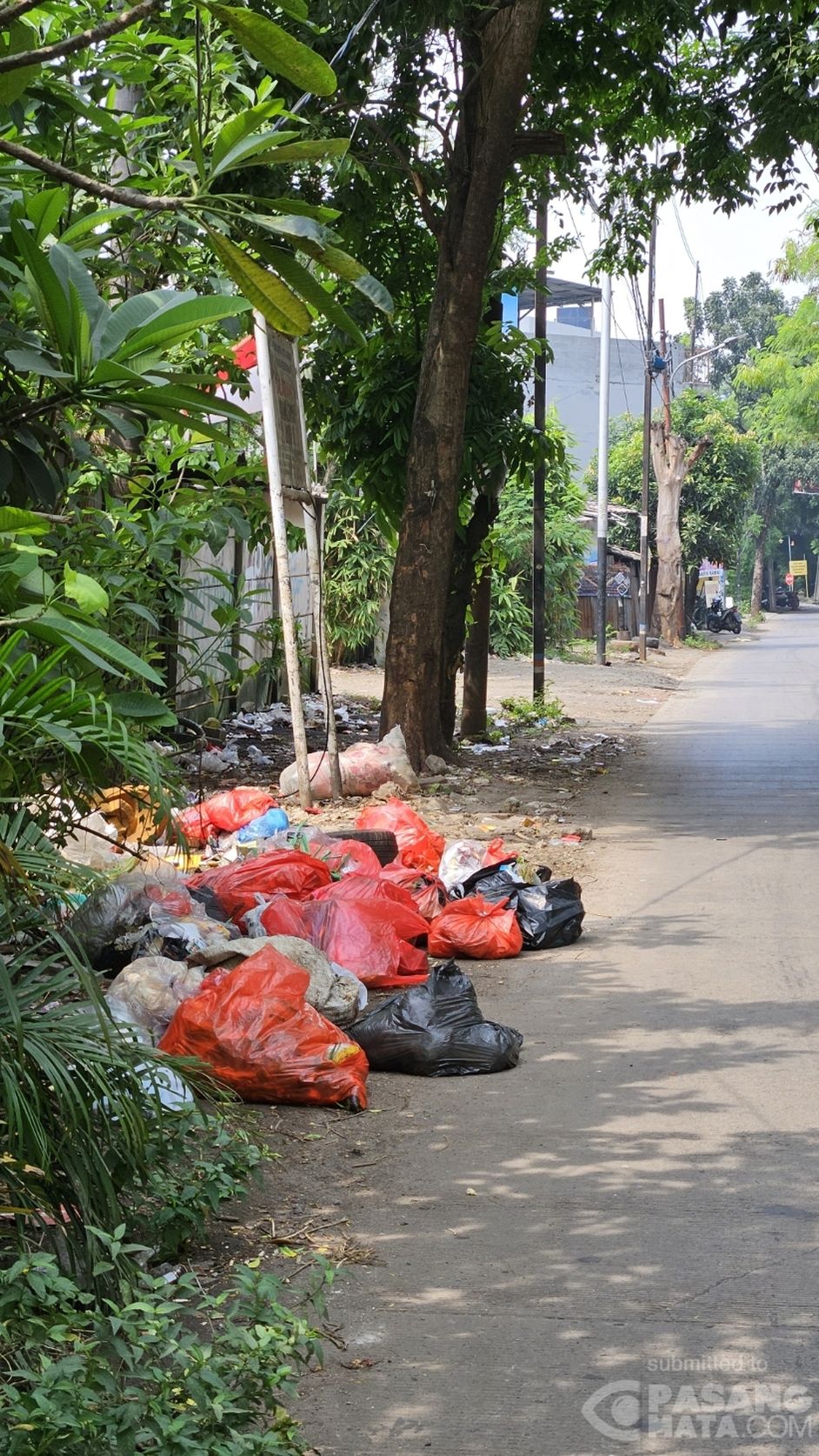 Sudah ada larangan buang sampah, namun warga masih saja buang sampah di pinggiran jalan arah pintu tol masuk Jatiwarna Bekasi.