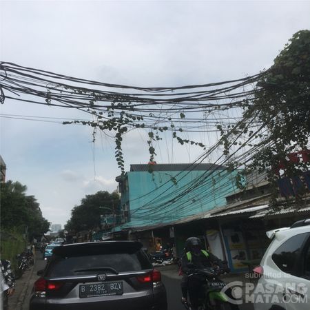 Kabel listrik yang semrawut menyatu dengan dedaunan di…