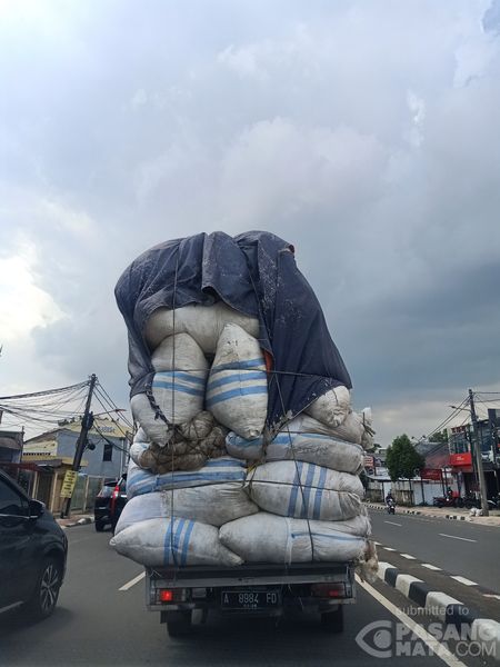 Mobil pick up dengan muatan berlebih melintas di jalan Dewi…