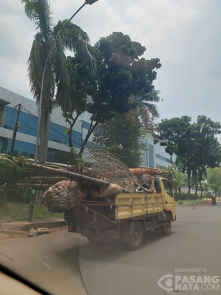 Truk membawa muatan pepohonan palm dan kamboja di Bintaro